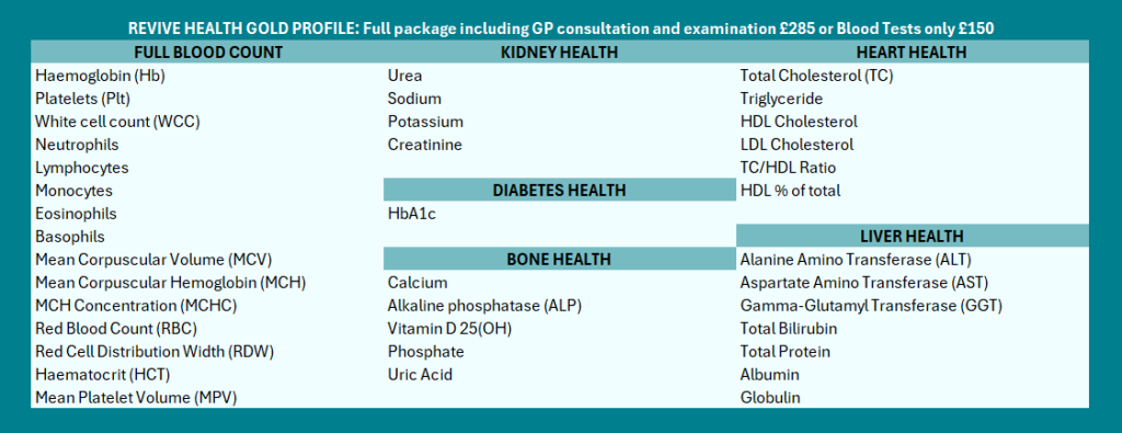 At Revive Health, we offer three levels of full-body health screens, each designed to provide a tailored combination of biometric and cardiovascular tests. Our biometric testing services provide a detailed overview of your body’s well-being, supported by insight from our experienced GP team, to help you proactively manage your health.
