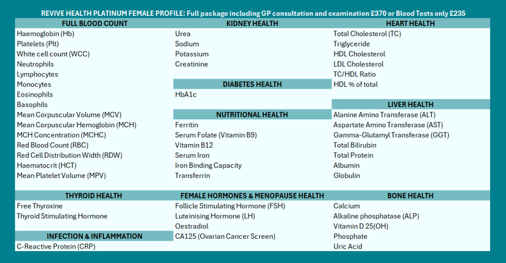 The Platinum Package includes everything in the Gold Package, with the addition of hormonal health assessments tailored to your biological sex and specific cancer screening tests.